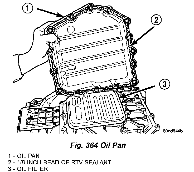 7. Install an 1/8" bead of RTV as shown in (Fig. 364) and install pan to case.