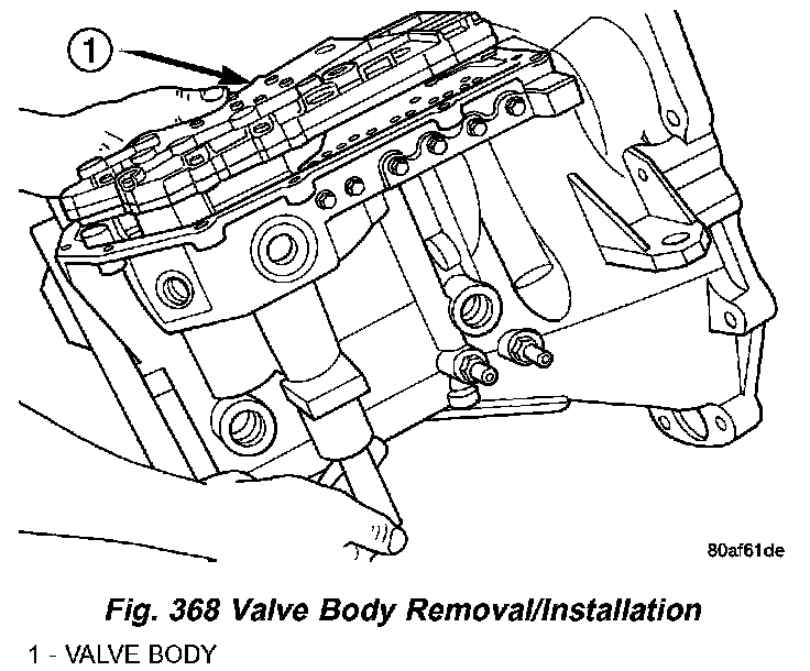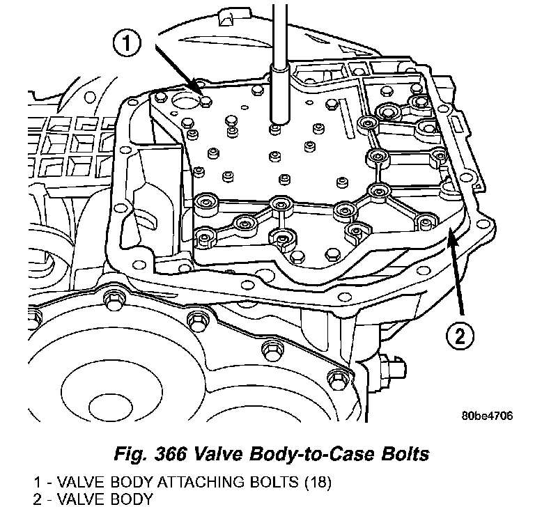 5. Install the valve body-to-case bolts (Fig. 366) and torque to 12 Nm (105 inch lbs.).