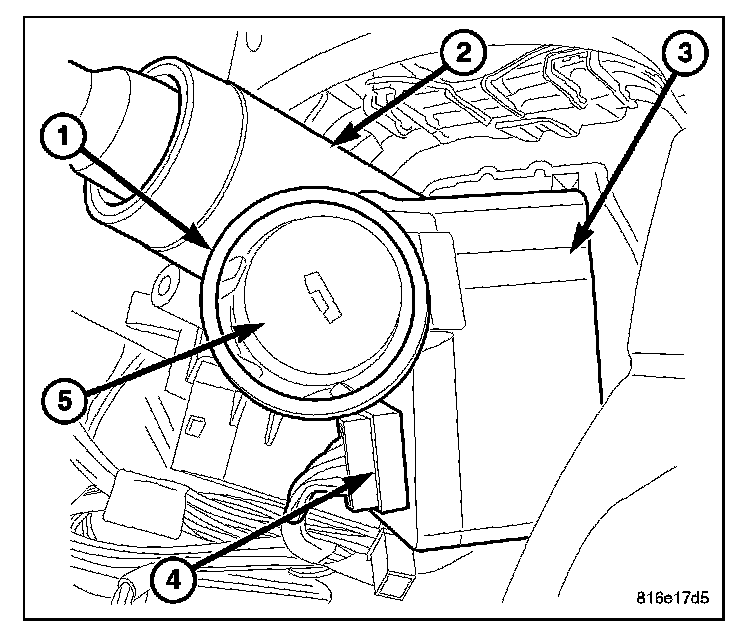 A single connector (1) is located next to the antenna ring on the SKREEM/WCM housing. A molded plastic mounting tab (2) on the SKREEM/WCM housing secures the unit to the steering column. The SKREEM/WCM is connected to the vehicle electrical system through the instrument panel wire harness. The SKREEM/WCM cannot be adjusted or repaired. If faulty or damaged, the entire SKREEM unit must be replaced.