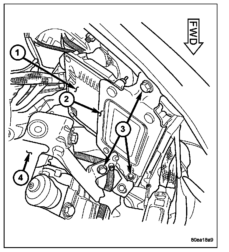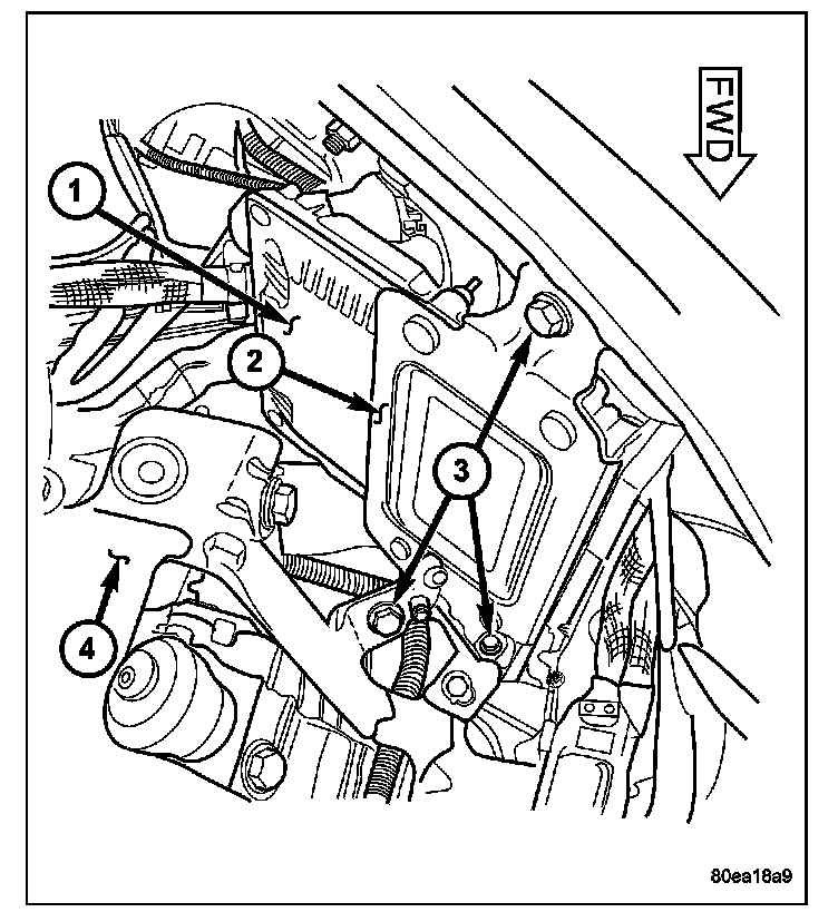 4. Remove ECM bracket (2) retaining bolts (3) and remove ECM and bracket (2) assembly from vehicle.