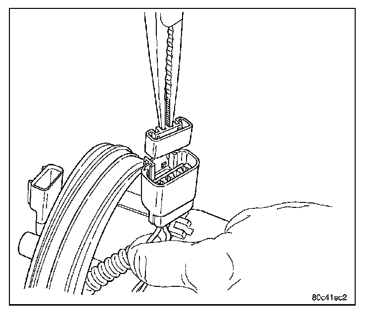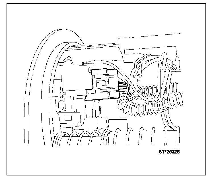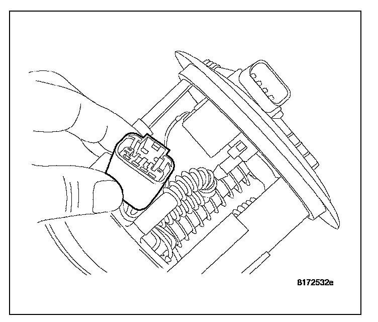 2. Depress retaining tab and remove the fuel pump/level sensor connector from the BOTTOM of the fuel pump module electrical connector.