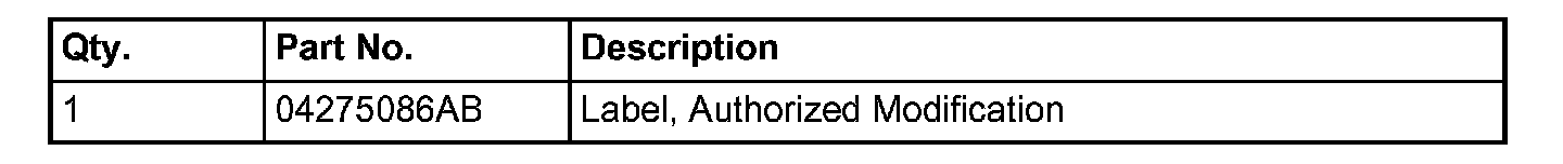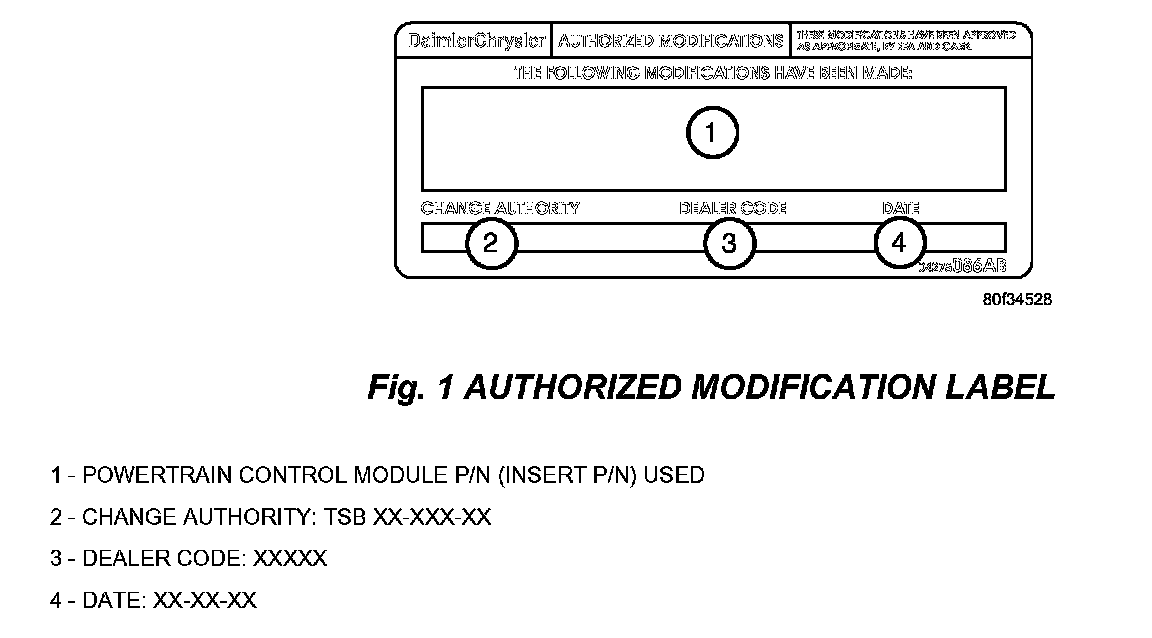 7. Type the necessary information on the "Authorized Modification Label" p/n 04275086AB and attach near the VECI label (Fig. 1).