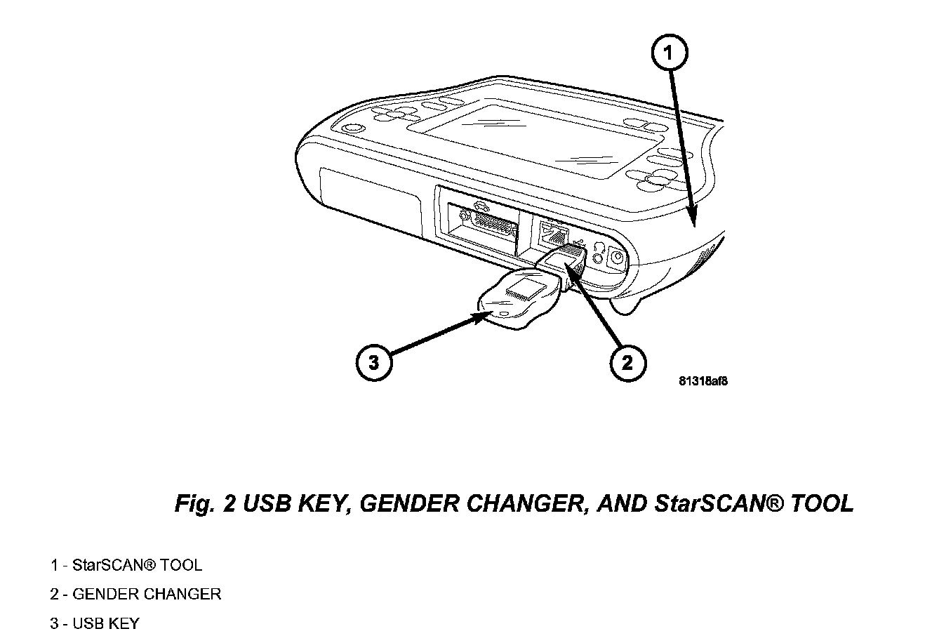 7. With the StarSCAN(R) powered OFF, connect the USB Key and Gender Changer to the StarSCAN(R) USB port (Fig. 2).