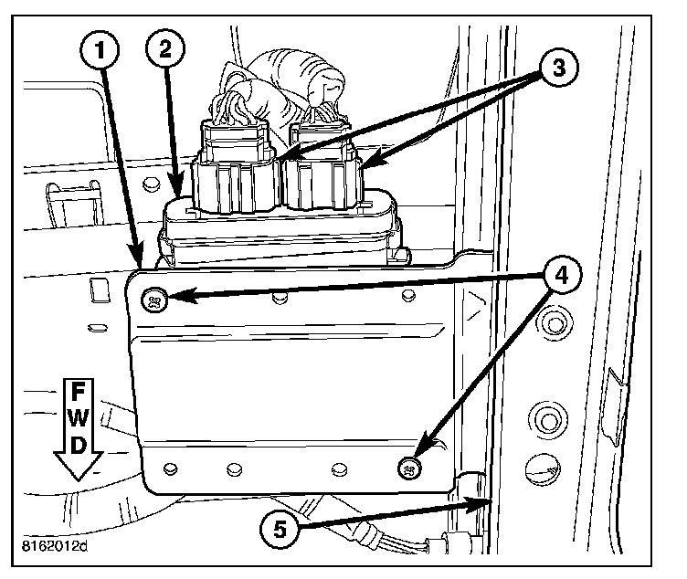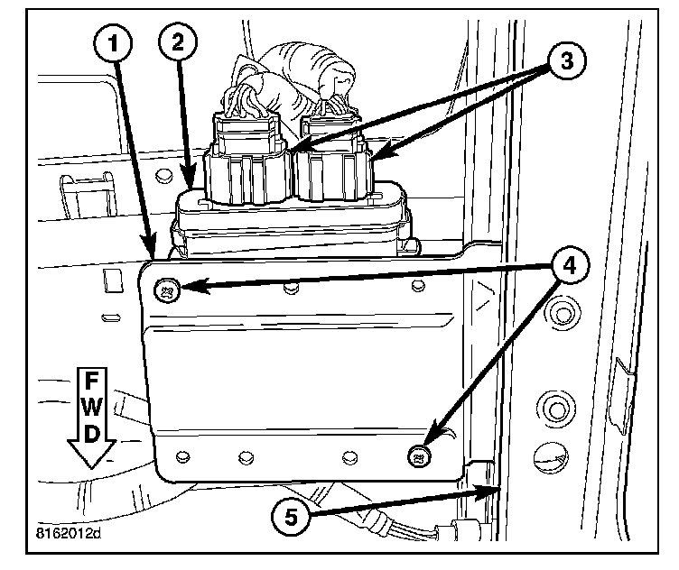 2. Reach under the front edge of the passenger side front seat cushion to access and remove the two screws (4) that secure the Occupant Classification Module (OCM) to the OCM bracket (1) on the passenger front seat track riser (5).