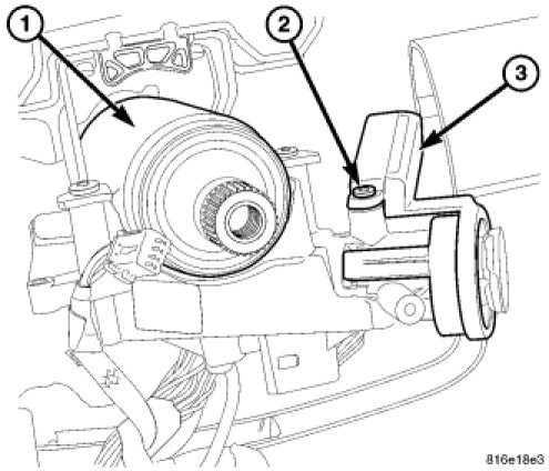 NOTE: The Steering Column Control Module (SCCM) assembly, which consists of the left/right multi-function switches and the clockspring, does not have to be removed to service the SKREEM/WCM. After removing the right multi-function switch, there is an access hole to access the SKREEM mounting screw (2).