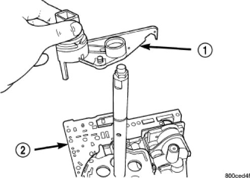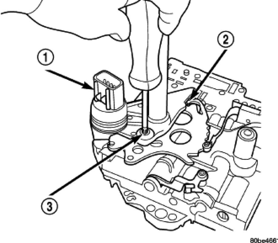 The valve body assembly (2) must be removed to gain access to and replace the transmission range sensor (1).