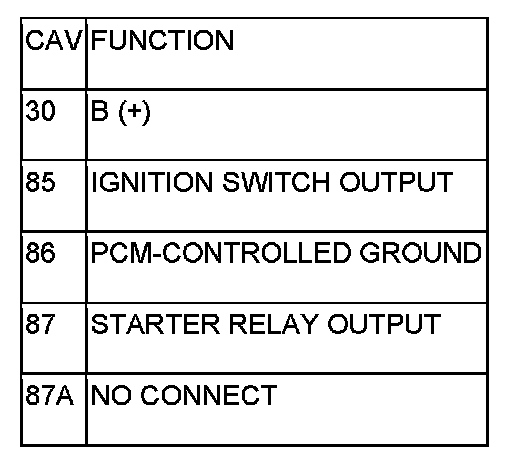 5. The coil ground terminal (86) is connected to the electromagnet in the relay. It is grounded by the PCM if the conditions are right to start the car. For automatic trans. cars the PCM must see Park Neutral switch low and near zero engine speed (rpm). For manual trans. cars the PCM only needs to see near zero engine speed (rpm) and low clutch interlock input and see near zero engine speed (rpm). To diagnose the Park Neutral switch of the trans range sensor refer to the transaxle. Check for continuity to ground while the ignition switch is in the start position and if equipped the clutch pedal depressed. If not OK and the vehicle has an automatic trans. verify Park Neutral switch operation. If that checks OK check for continuity between PCM and the terminal 86. Repair open circuit as required. Also check the clutch interlock switch operation if equipped with a manual transmission. If OK, the PCM may be defective.