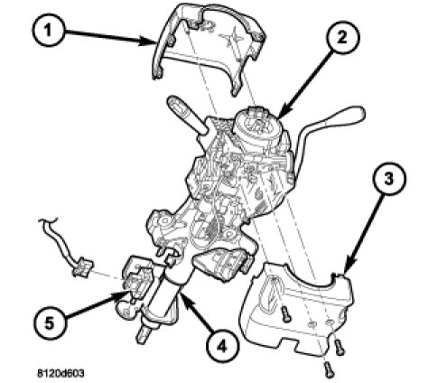 3. From below the steering column, remove the two outboard screws that secure the upper column shroud (1) to the lower shroud (3).