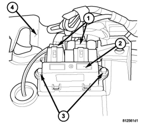 4. Remove the two screws (3) that secure the blower motor power module to the front HVAC housing (4).