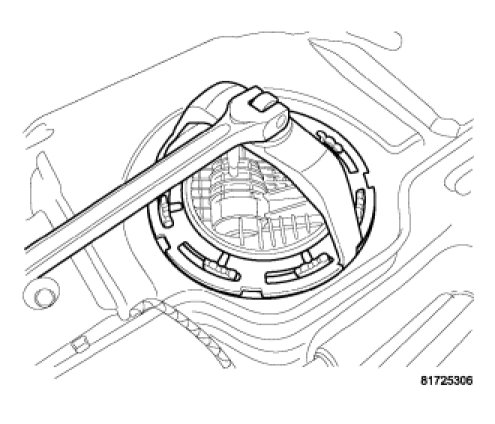 CAUTION: Mark the position of the fuel pump module on the top of the fuel tank prior to removal. The pump has to be properly aligned in the tank for the fuel gauge to work properly.