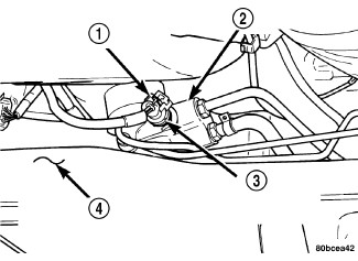 2. Connect the wiring harness connector (1) to the power steering fluid pressure switch (3). Be sure the locking tab on the wiring harness connector is securely latched following installation.