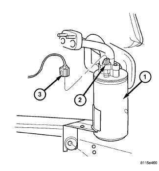 2. Install the A/C low pressure switch (2) onto the top of the A/C accumulator (1). Hand-tightened the switch securely.