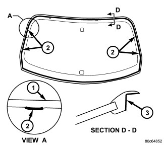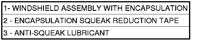 3. Verify replacement windshield has squeak tape (2) and anti-squeak lube (3). If not present, install squeak tape and anti-squeak lube.