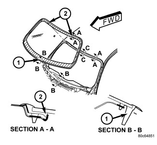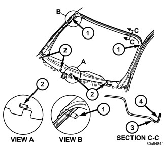 11. Apply a bead of urethane (4) on windshield glass as indicated.
