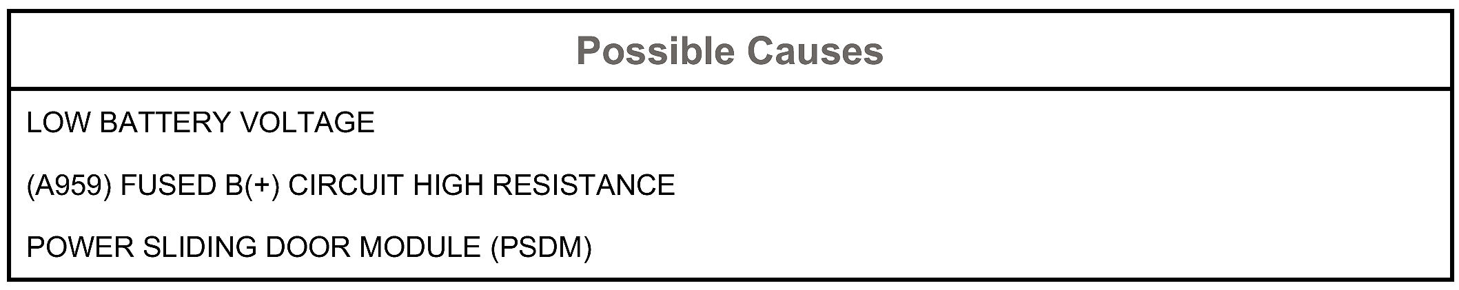 When the Power Sliding Door Module detects input voltage below 10.0 volts for more than 15 seconds, this code will set.