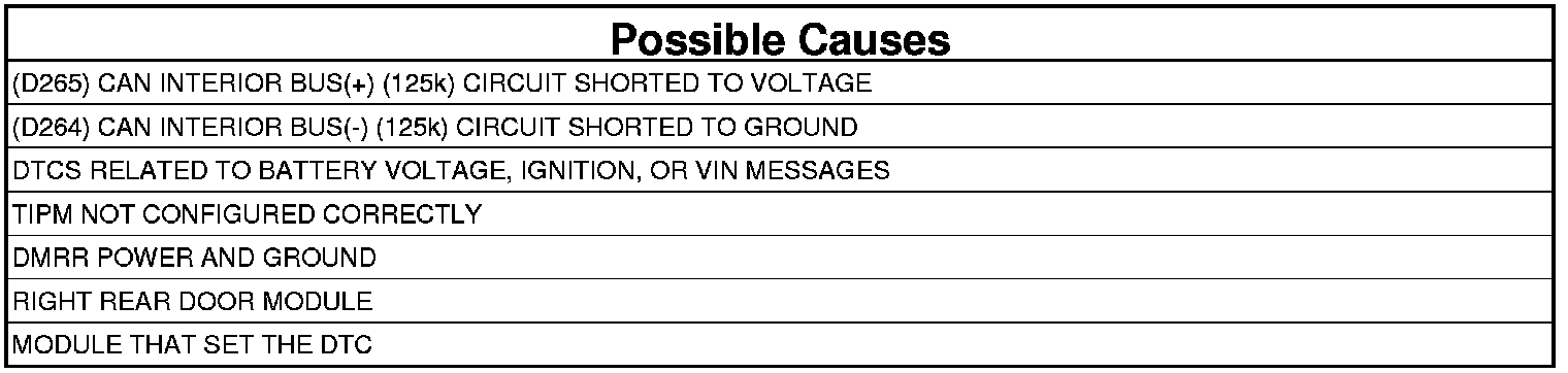 - Repair the (D264) CAN Interior Bus(-) (125K) circuit for a short to ground.