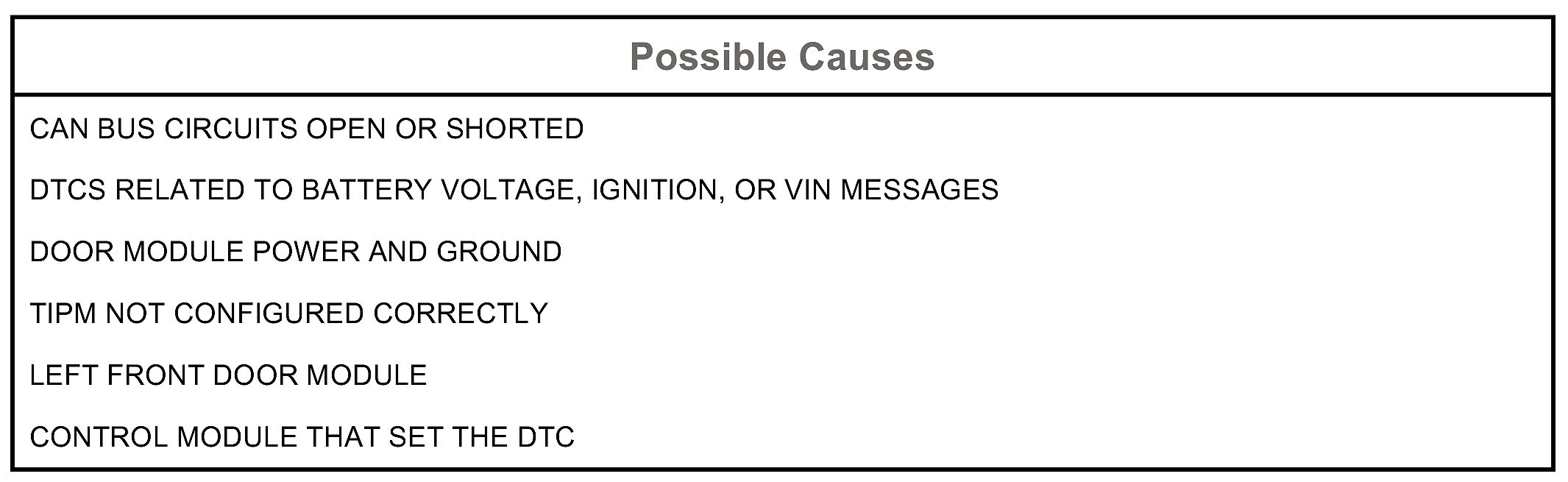 - Perform the Totally Integrated Power Module (TIPM) U0203-Lost Communication with Door Module Front Left diagnostic procedure.