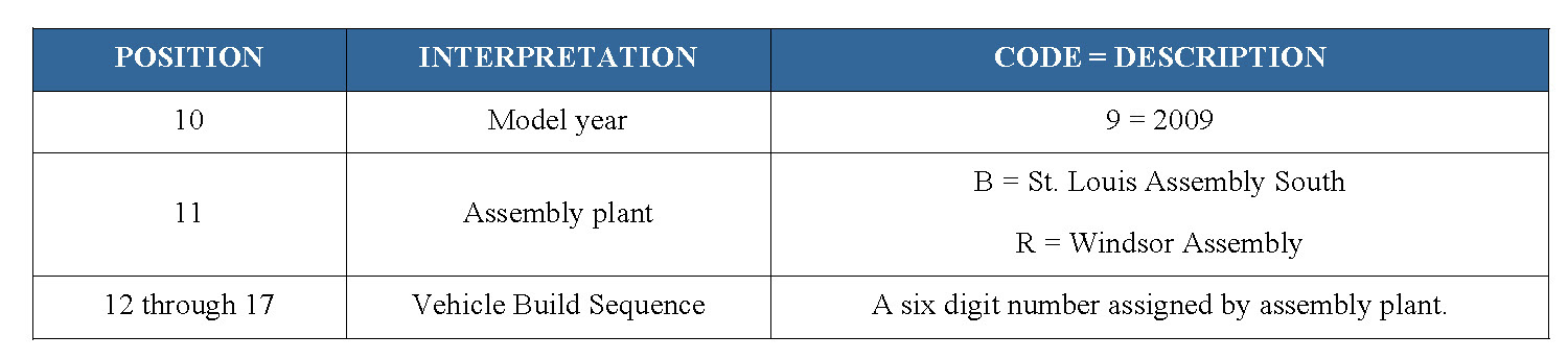 2009 VIN DECODING INFORMATION