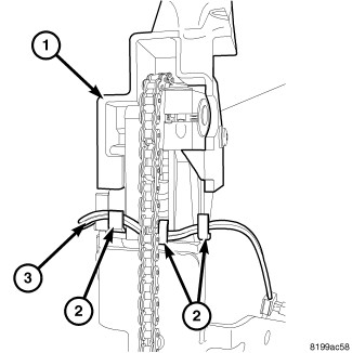 2. Ensure the full open switch wire harness (3) is routed properly through the power liftgate drive unit routing tabs (2).