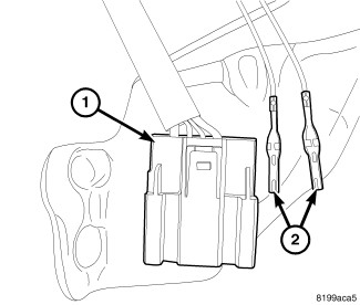4. Insert the full open switch wire terminals (2) into the liftgate drive unit connector (1) ensuring the proper terminal location as noted in the full open switch removal procedure.