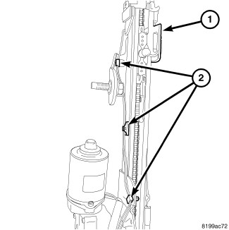 6. Carefully remove the full open switch wire harness routing clips (2) from the power liftgate drive unit assembly (1).