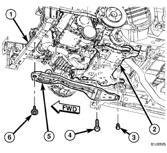 2. Position fore-aft crossmember in engine compartment and install mounting bolts (3, 4, 6). Tighten forward mounting bolt (6) to 113 Nm (83 ft. lbs.). Tighten rearward mounting bolts (3, 4) at suspension crossmember (2) to 55 Nm (41 ft. lbs.).