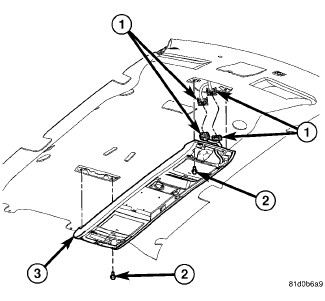 6. Grasp the overhead console (3) and give a firm tug downwards to disengage the console from the roof retainers.