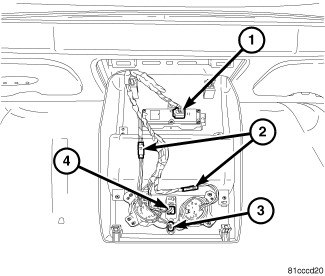 5. If equipped, disconnect the courtesy lamps (2), Light Emitting Diode (LED) lamp (3), infrared temperature sensor (4) and power sliding door/liftgate switch (1) electrical connectors.