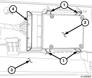 1. Position the power seat switch (2) onto the seat cushion side shield (3). Gently apply pressure to the switch until the four mounting tabs (1) are fully seated into place.