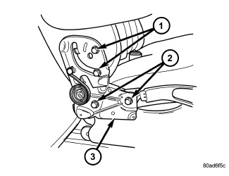 1. Position the seat back to the seat back hinges (3) and install the retaining bolts (1). Tighten the bolts to 48 Nm (35 ft. lbs.).