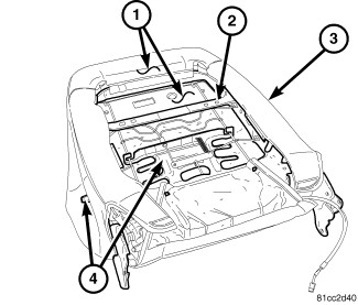 1. Install the lumbar support and handle mechanism (4) onto the seat back frame (2) Front Lumbar Support - Installation.