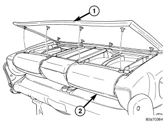 1. On three passenger bench seats, position the seat back panel (1) to the seat back frame and engage the push-in fasteners.
