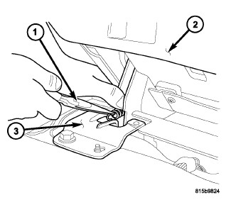 7. Using locking needle nose pliers (1), remove the spring from the floor attaching bracket (3). Once the bracket end is loose, remove the spring from the cable end. Continue holding the cable end. The seat must remain at the 20-45° angle (2) and the leg on the outboard side of the seat must be held down to keep slack in the cable.