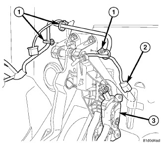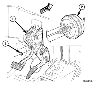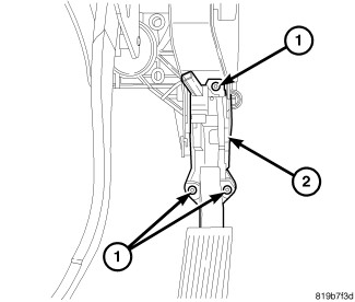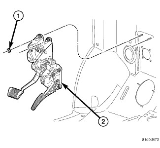 2. Install pedal assembly (2) under instrument panel and slide onto power brake booster and dash-mounted studs.