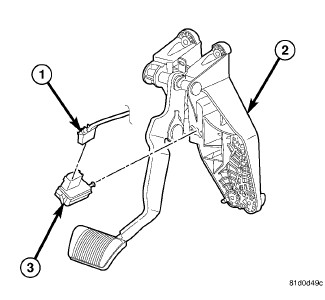 7. Connect wiring connector (2) at electronic throttle control (accelerator) (3).