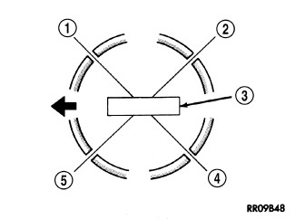 1. Before installing pistons and connecting rod assemblies into the bore, ensure that compression ring gaps (2,5) are staggered so that neither is in line with oil ring rail gap (1,4).