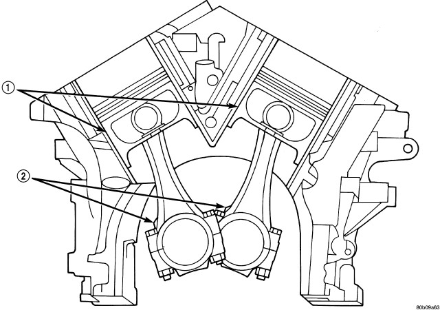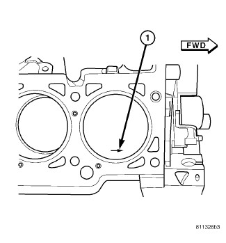 6. The pistons are marked with an arrow (1) on top of the piston. Install piston with this mark positioned to front of engine on both cylinder banks.