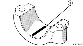 4. Place a piece of Plastigage (1) across the entire width of the bearing shell in the cap approximately 6.35 mm (1/4 in.) off center and away from the oil holes. (In addition, suspected areas can be checked by placing the Plastigage in the suspected area). Torque the bearing cap bolts of the bearing being checked to the proper specifications.