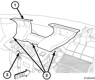 1. Position the defroster duct (1) onto the top of the HVAC air distribution housing (3).