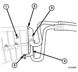 2. Install the screw (5) that secures the rear heater core tube bracket (4) to the rear heater-A/C housing. Tighten the screw to 2 Nm (17 in. lbs.).