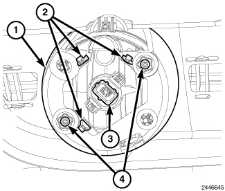 4. Reconnect the front end module wire harness connector to the front fog lamp bulb connector receptacle (3).