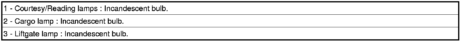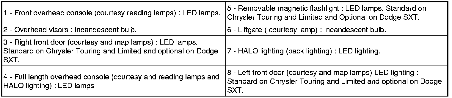 The interior/courtesy lighting is supplied by a combination of Light Emitting Diodes (LED) and incandescent bulbs. The LED's are not replaceable and are serviced as a LED pod. Model line and interior package will determine what the vehicle is equipped with.