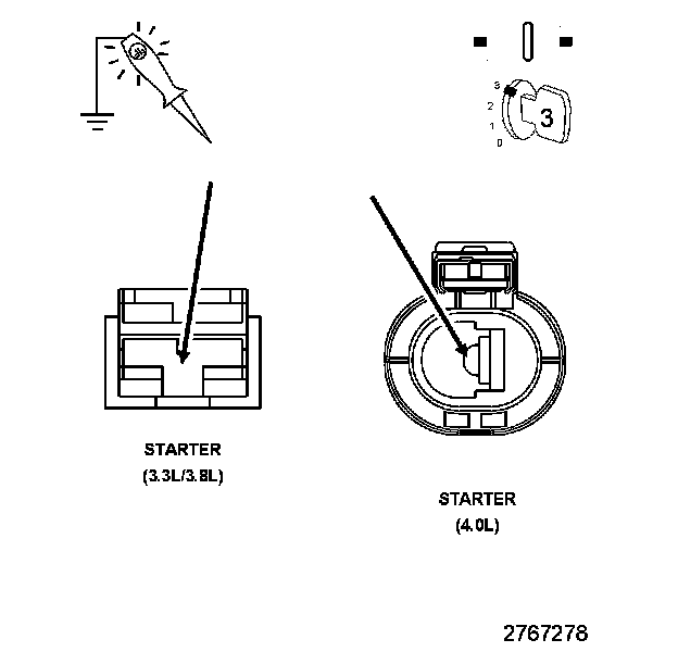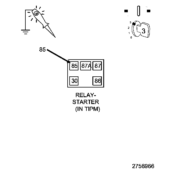 1. Connect a 12-volt test lamp between the Starter Coil Driver and the (T752) Starter Relay Control circuit in the TIPM.