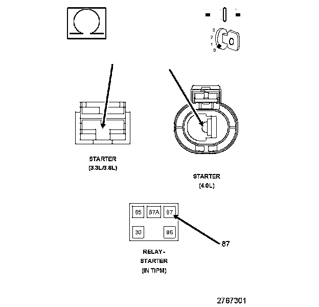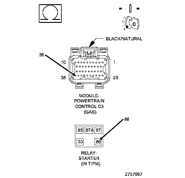 1. Using the wiring diagram/schematic as a guide, inspect the wiring and connectors between the Starter Relay and PCM.