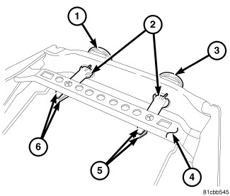 1. Push the head restraint sleeves (1 and 3) downward until the retaining tabs (2) and retaining barbs (5 and 6) are fully engaged to the seat back frame (4).