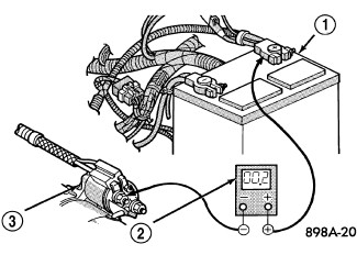 3. Connect the voltmeter (2) to measure between the battery positive cable terminal clamp (1) and the starter solenoid B(+) terminal stud (3). Rotate and hold the ignition switch in the Start position. Observe the voltmeter. If the reading is above 0.2 volt, clean and tighten the battery positive cable eyelet terminal connection at the starter solenoid B(+) terminal stud. Repeat the test. If the reading is still above 0.2 volt, replace the faulty battery positive cable.