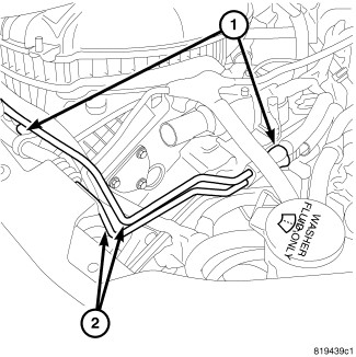 16. Install the bolts (1) holding the power steering lines (2) and tighten to 10 Nm (90 in. lbs.).