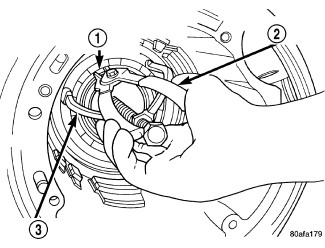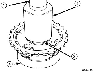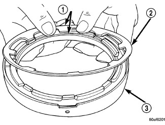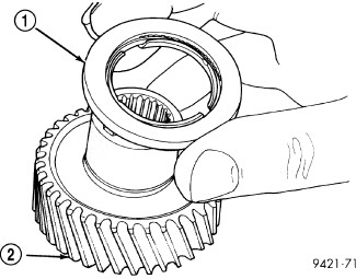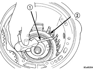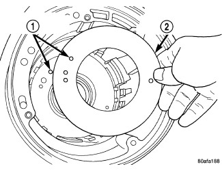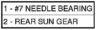 NOTE: The number seven needle (1) bearing has three anti-reversal tabs and is common with the number five position. The orientation should allow the bearing to seat flat against the rear sun gear. A small amount of petrolatum can be used to hold the bearing to the rear sun gear (2).