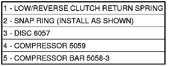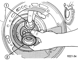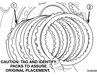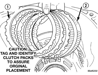 19. Install low/reverse clutch pack (1,2). Leave uppermost disc out until snap ring is installed.
