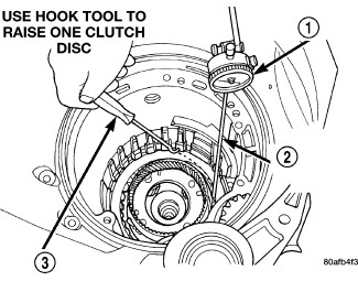 31. Set up dial indicator (1) and measure 2/4 clutch clearance. Press down on clutch pack with finger and zero dial indicator. 2/4 clutch pack clearance is 0.76-2.64 mm (0.030-0.104 in.). Set up indicator and record measurement in four places. Take average of readings. If clearance is outside this range, the clutch is assembled improperly. There is no adjustment for 2/4 clutch clearance.